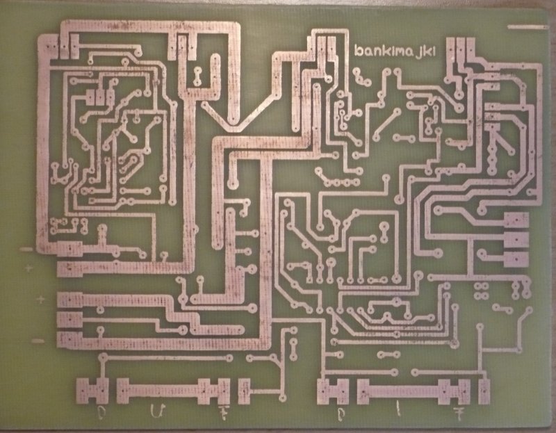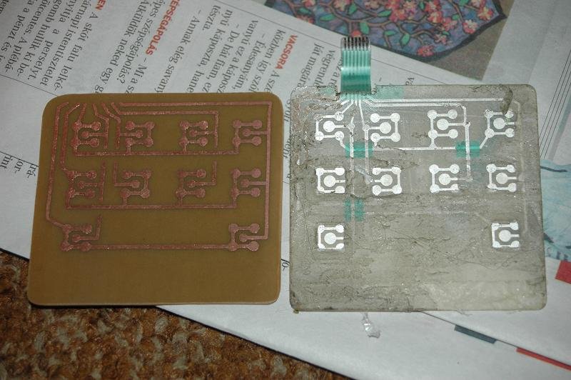 Haver klima töltéshez használt precíziós mérlegének befolyt a víz a kezelő gomb fólia alá, és megette a fólia huzalozást. Készítettem panelre egy testvérét, expresspcb-vel, majd printscreen, photoshop tükrözés, és wordbe kinyomtat, vasal, marás és ez let belőle ami a képen van.