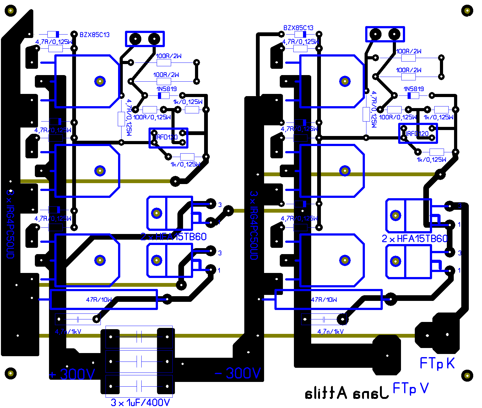 Kicsit átrajzoltam a főpanelt,szerintem ez jobb mint eredetileg volt,mellékelem,ez a forrasztási oldal,az alkatrészek a túloldalon vannak kivéve a 2,2µF kondit.Az Ft a főtrafó csatlakozási pontja.A vastag,nagy áramú részekre 1,5mm2 vezeték van végigforrasztva.Nézd,nézzétek át,az eredeti megoldással is kifogástalanul megy a gép a mai napig is,de minden tanácsot szívesen elfogadok! Válaszolnék pimi9,azért van bent 6 IGBT-nek hely mert csak BUP304 volt egy rahedlivel,mikor a panelt és a gépet készítettem,ezek 1200V/35A ,de lehet módosítani,ki ahogy akarja.