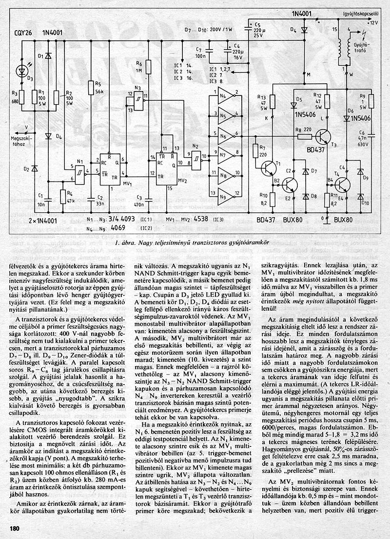-Lehet, hogy ezen áramkör tervezésénél is a gyújtóáramkörök gyengéjét vették figyelembe, miszerint is , általában, a gyútrafót egy tranzisztor is meghajtaná, de mivel ez az eszköz alaposan "nyúzva" van, (nagy áram, feszültségtranziensek) ezért azt megkettőzik. Lehet, hogy indokolatlan a félelmem, de én a végfokozatot átkapcsolhatóan kettőzném meg. Nem kellemes lerohadni a semmi közepén. A másik megoldás a már említett áthidalás.