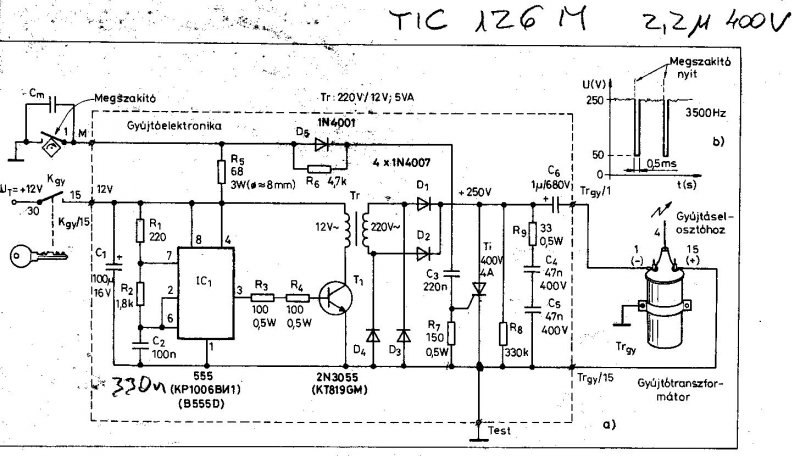 Én ezt építem meg majd. Állítólag elég jó. De valamit nem értek: nekünk a kocsiban(Skoda120) a megszakítóra nem párhuzamosan van kötve az a kondenzátor, ami a megszakítót védi, hanem VELE SORBA. Szóval a megszakító egyik kivezetése megy a testre, másik a kondi egyik lábára, és a kondi másik lába megy a gy.trafóra.