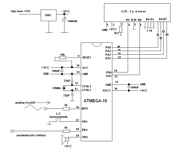 A pozitív tápfeszt az LM311 a 8-as(V) lábán kapja, innentől értelemszerű hogy hová kell bekötni... Ja igen. a relét sem tartalmazza, mert még olyan friss ez a kapcsolás. Amúgy a relét egy NPN tranzisztor hajtotta meg a régi változatban. Tehát ha az ATMEGA16 PD4 portján pozitív feszültség jelenik meg, akkor átvált kapacitásmérő fokozatra. Az átkapcsoláshoz a nyomógombot le kell nyomni, az átkapcsolást a kijelzőn váltakozó "C=" és "L=" feliratok, illetve a kis hangszóró csippanása jelzi. A nyomógombot szoftverből pergésmentesítettem, a hangszóró egy kis fekete henger alakú NYÁK-os speaker, a kontroller bőven elbírja.