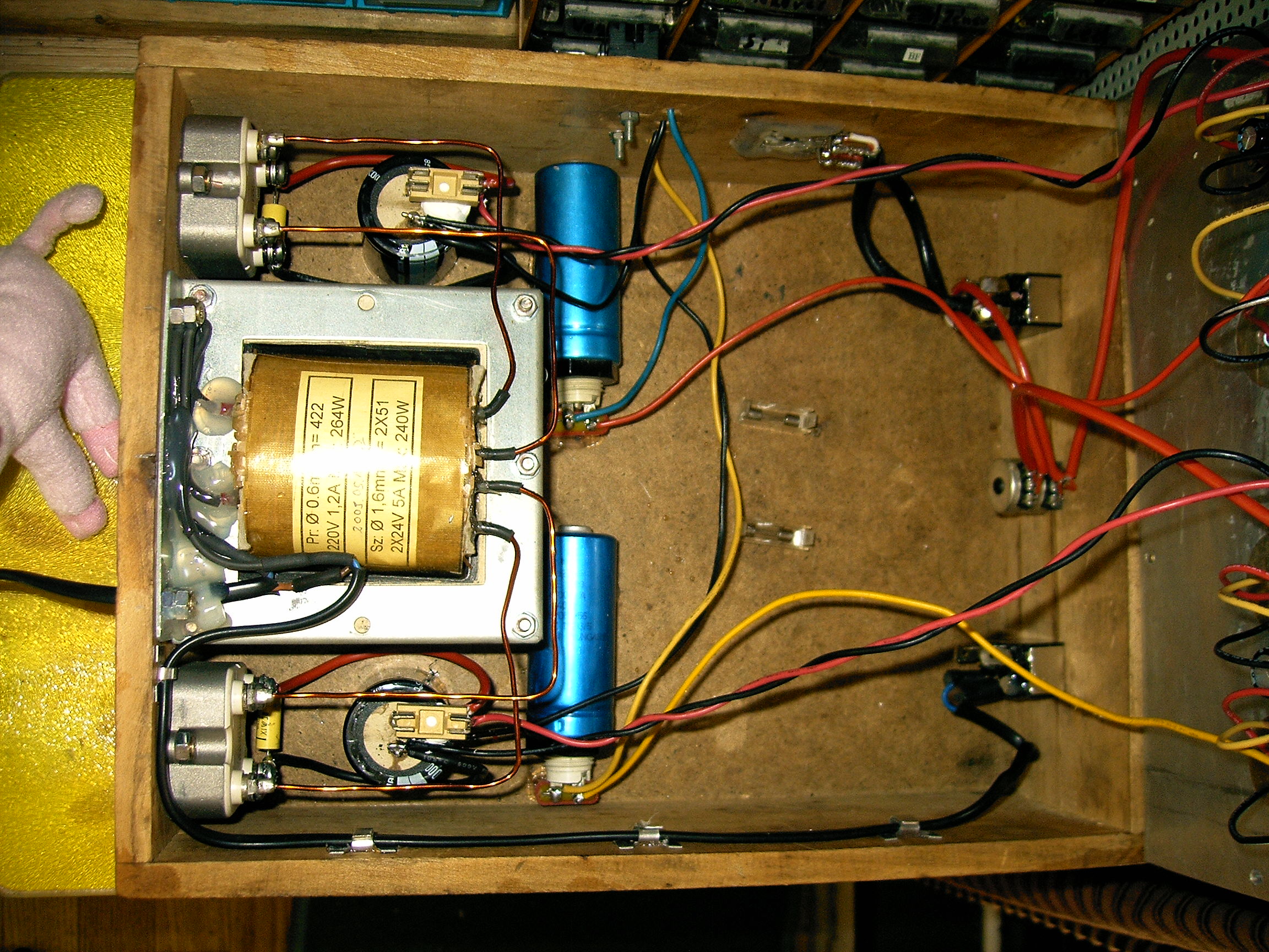 Az első képen az látszik, hogy én egy 320X250X6mm alumínium lemezre raktam a 2N3055 tranzisztorokat. A szigeteléssel nekem is meggyűlt a bajom, a lábaira (E,B) például 1,5mm˛ szilikon szigetelésű vezeték szigetelését húztam. A panel azért csálé mert nincs odacsavarozva teljesen, plusz még az egyik panelből hiányzik egy kondi. Azóta pótolva a hiány. A nyugalmi áram beállításához én is 50K potméter használok, még így is húzós a finom állítás! A második képen csupán az elrendezés látszik, de őszintén szólva a csatoló kondik nagyon rossz helyen vannak ott a trafó mellett. Viszont ha bejön a kondi csere, úgyis mennek a kukába. A fa doboz tudom, hogy nem praktikus, de megvan a maga hangulata szerintem.