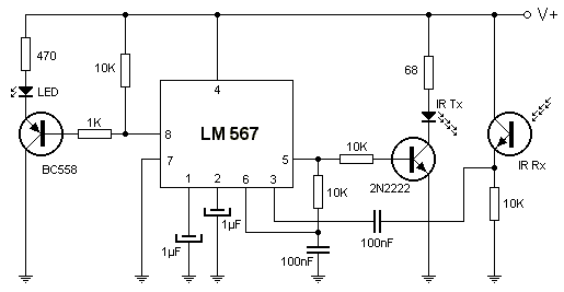 Idézet: „Egyszerű módon felépíthető az alábbi infrakapu melyhez egyetlen IC és néhány kiegészítő alkatrész kell. Az LM567 egy hangfrekvenciás dekóder lényege abban van, hogy rendelkezik egy belső oszcillátorral amit egy külső RC kör határoz meg milyen frekvencián rezegjen. Ha kap a bemenetére egy megegyező frekvenciájú jelet akkor akkor a kimenet aktívvá válik. A megoldás a következő: egy infraled kisugározza a saját oszcillátor jelét és azt egy vele szembefordított fototranzisztor veszi ami a bemenetre van kapcsolva, így az áramkör kimenete aktív lesz folyamatosan mivel a bemeneten lévő frekvencia megegyezik a belső oszcillátor frekvenciájával, ami tulajdonképpen a saját jele. Ha viszont az adó és vevő közötti térbe valami akadály kerül akkor a kisugárzott jel nem jut vissza a vevőbe így a kimenet állapota megváltozik.” Nem próbáltam ki, nem tudom milyen érzékenysége lehet.. A bordó plexi azért kell, hogy a mindenféle fény ne vezérelje túl a bemeneti erősítőt (ha van) A lámpák, napfény elég sokat sugároz infra tartományban is, de legalább a többi fény kevésbé zavar be.