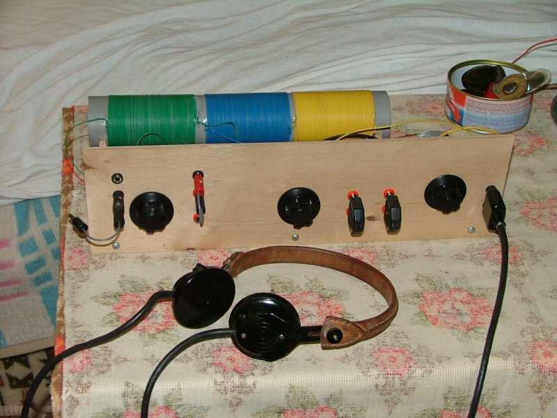 Miután meggyőződtem arról, hogy a kép is felkerült, folytatnám a bemutatást. A 3 egyforma tekercs csévetest átmérője 50 mm, menetszám 70,a huzal 7X0,17 mm. átmérőjű egymástól nem szigetelt úgynevezett riasztó kábelből nyert vezeték. Az előlapon látható két dugvillába van beépítve két OA 1160 germánium dióda. A fül hallgató 4000 ohmos.A rádió olyan hangerőt produkál, hogy el kell hangolni mert túl hangos.