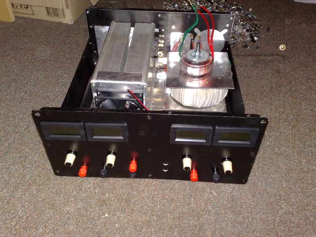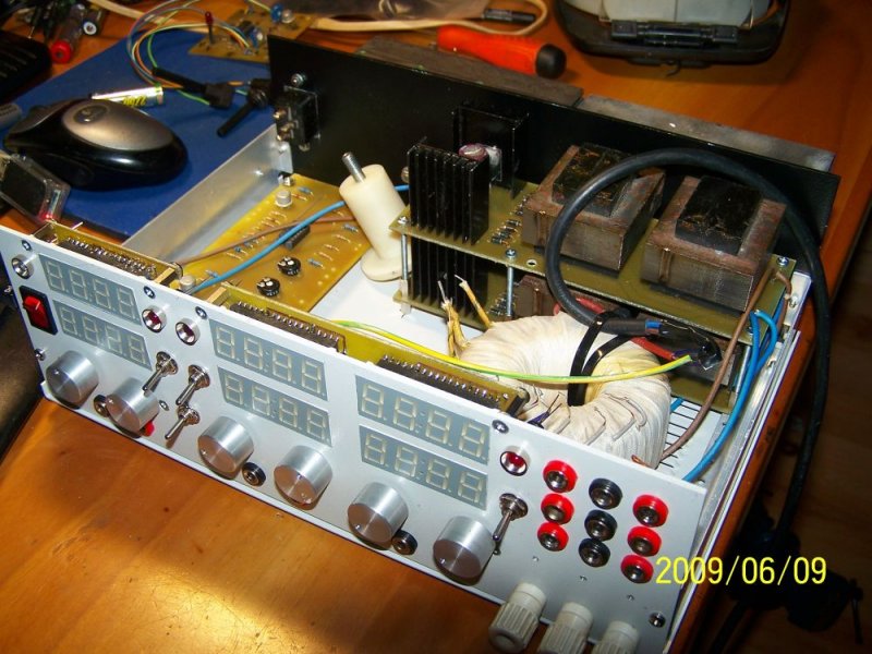 Régóta, de készül a tápegységem. Alkotó panelterve alapján a Spafi féle 0-50V 4A max. Lesz rajta fix 12V1A és 5V1A is Holnap jönnek még apróbb alkatrészek. Már csak egy panelt kell csinálnom. A két fő panel készen van. Ízelítőnek egy kép.