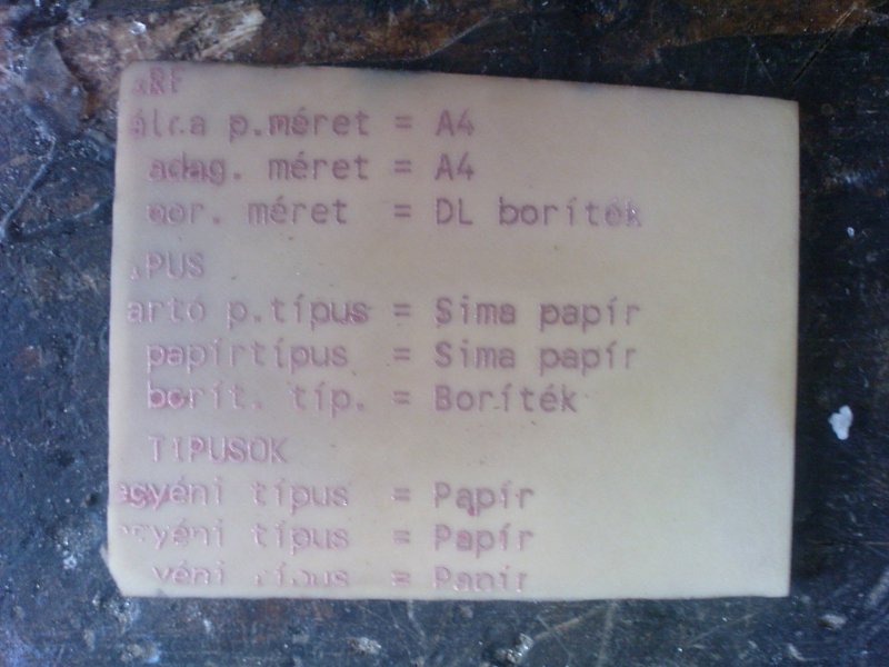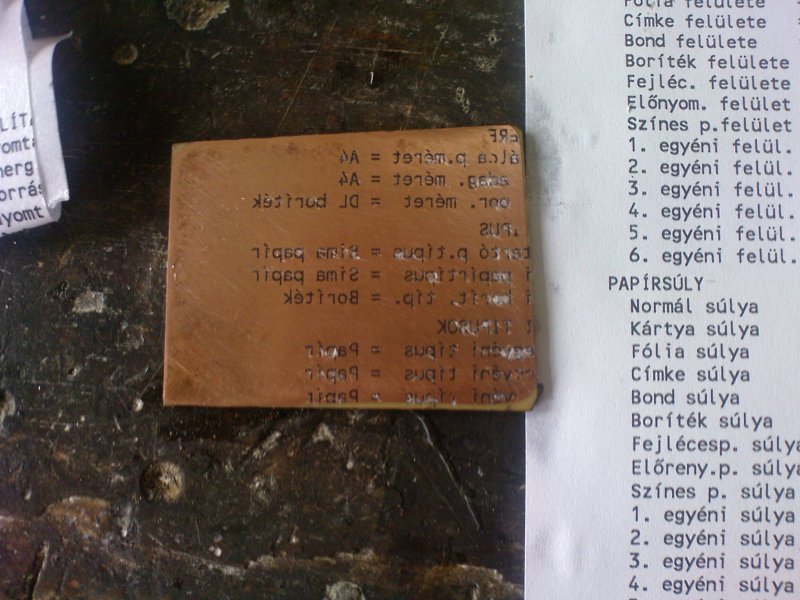 Tegnap megkaptam az új tonert a nyomtatóba így ismét kipróbáltam a vasalást ,csak kíváncsiságból. Nem volt kedvem nyomtatni valami rajzot, így egy kinyomtatott tesztlapból vágtam ki egy darabot. A nyák egy régi tiszta oxidálódott darab volt, amit finom csiszolópapírral felcsiszoltam. Ezután hőlégfúvóval felmelegítettem a panelt és rátettem a papírdarabot. Egy papírzsepivel áttöröltem egy párszor, megvártam míg lehűl, majd leáztattam. A képen az eredmény. Sima fénymásolópapírral csináltam. Csodálkoztam is, hogy ilyen jól átragadt. Ha már itt tartottam, akkor ki is marattam. Szerintem jó lett. A betűméret kb 8-10-es lehet.