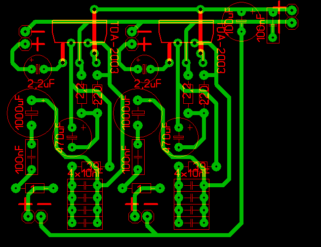 Szeretnék építeni egy 10W-os erősítőt, egy adatlapban találtam egy kapcsolást, ami alapján készítettem el egy nyákrajzot, és azt szeretném kérni tőletek, hogy nézzétek meg, hogy jó-e.