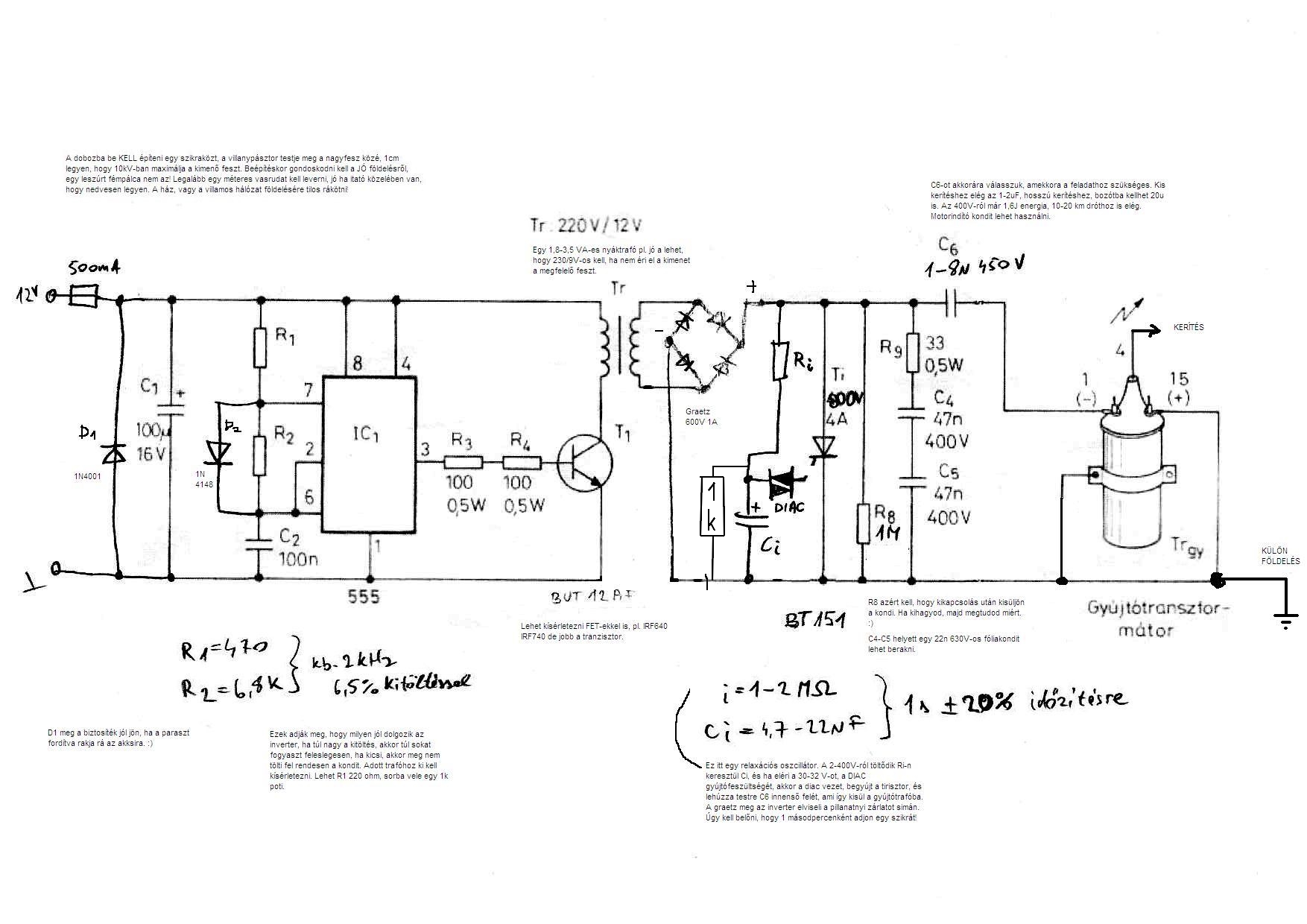 Villanypásztorba bőven elég 8-10W-os trafó és kapcsolás.Én is tekertem már sorkimenő vasmagra +sz.gép táp magra,simán kijön 3Kv diódák nélkül 20KHz-en.A meghajtás 555Ic-vel megy kapcs.tranzisztor BUT11A,BUT18A,de volt már IRF634 fet is beépítve,ezzel sem melegedett jobban.Mindig amit találok itthon azt teszem be,erre a kis frekire sok minden +felel.