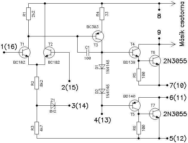 A BC301-est és BC303-ast helyettesítheted, más BC, vagy BD komplementer párral. Itt szó sincs darlington kapcsolásról, mivel ezen két tranzisztor kvázi emitter kapcsolásban van, így fázisfordító szerepük van. Annak idején BC327/BC337 párost használtam, de számos más típus is jó lehet ide.