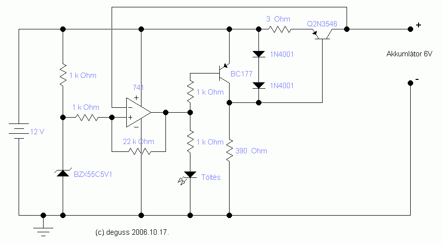 Készítettem egy kapcsolást a problémádra, elméleti síkon szerintem működik, többször is átgondoltam. Kb. 6,2V-ig egy áramgenerátor feltölti (max. 350mA), így rá lehet kötni teljesen lemerült vagy akár zárlatos akkumlátorokat is. A komparátor figyeli, hogy mikor éri el az akkumlátor feszültsége a kb. 6,2V-ot. Ha megtörtént, leáll a töltés, a led kialszik... De várom a nagy "szakik" véleményét, biztos van rajta "csinosítanivaló". Ha valami nem világos, tessék kérdezni! Üdv. deguss