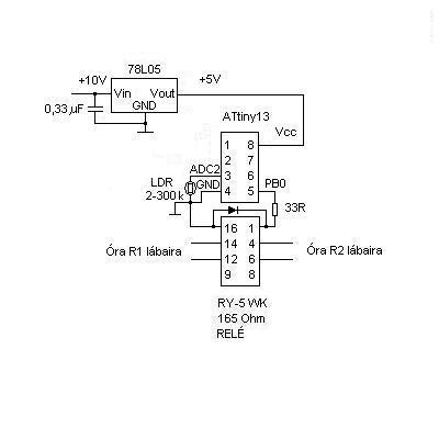 A relé előtti 33 Ohm csak azért van, hogy kisebb legyen a PB0-n kifolyó áram (25 mA).