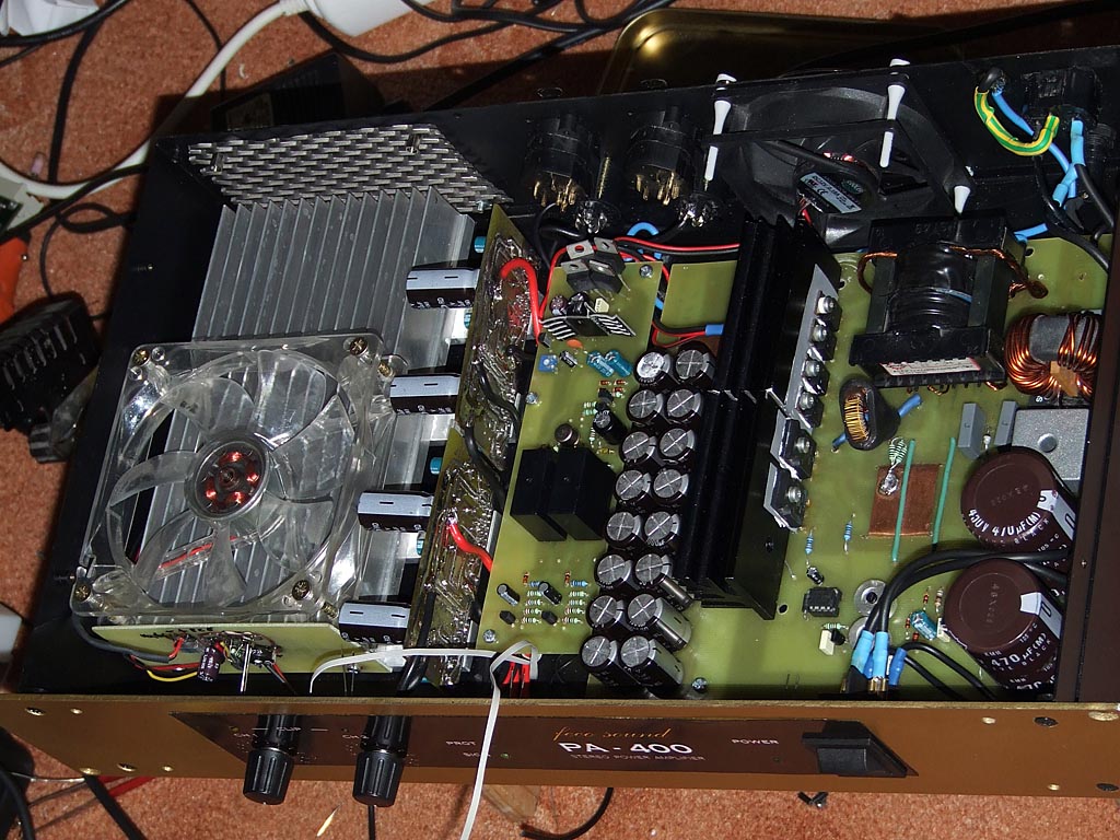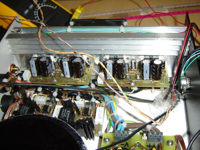 Kicsit átalakítottam a nyolc éves 7294 híd végfokomat,mivel jó áron jutottam toroid trafóhoz vettem két db 320W 2*25V-ost,l adott volt a régi táp azt meghagytam és készítettem a másik trafónak is egyet,majd mind a két trafót árnyékoltam.Igy most a két monoblock két külön tápról megy (2*40000uf szürés lett).Tettem még a dobozba egy mély váltót, és ennek egy stabilizált szürt szimetrikus +/-15v os tápegységet egy 2W-os öntött trafóval.Ez azért kellett,mivel többségben csak az egyik blokkot használom egy dupla mélynyomós mély láda meghajtásához 5,1 rendszerben,a bemenete és a kimenete is ki van vezetve két rca aljzaton a doboz hátulján,igy csak át kell kötni egy vezetékkel vmelyik csatornához,hogy aktiv szub legyen a rendszerből,vagy akár egy "y" kábellel elosztani a jelet és mind két végfokba bekötve két mélyládát is meg tud hajtani a két monoblock.Még adtam neki egy automata hűtés szabályozást is,ami két db 80*80mm-es 2,6W ventit működtet. Élőfoknak sztereó üzemben egy Omnitronic DJ50-et használok.Lemértem mit tud igy a "kicsike"; Tehát táp 640W 2*35V terheletlen és 2*30V max terhelésnél.Hálózati fesz stabilizált 230V.Hangszínszabályzó 0db állásban,direkt meghajtás. 8ohm hangfal,ill műterhelés 471.5W felvétel, 2*155W 0,8% . A 14,5cm hosszú,11cm széles 13 szárnyú borda 42fokon stagnált,a diódahidak (25A 400V) bordái 45 és 50 fokosak voltak.Trafók 45fok. Ezzel a táppal eszméletlen erőtartalékkal rendelkezik,nagy teljesítményen is stabil tiszta hanggal.