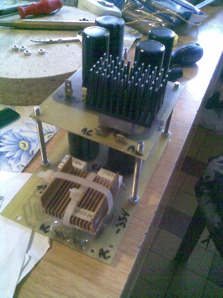 A jó ötleteket még kiegészíteném avval, hogy a legjobb megoldás, ha táp (az elkók és diódák) teljesen integrált a végfok panelen. Célszerű a csavaros elkók helyett beforraszthatót rakni, a "kocka" diódahíd helyett különálló gyorsdiódákat használni. +- os tápnál két graetzhíd szükéseg.