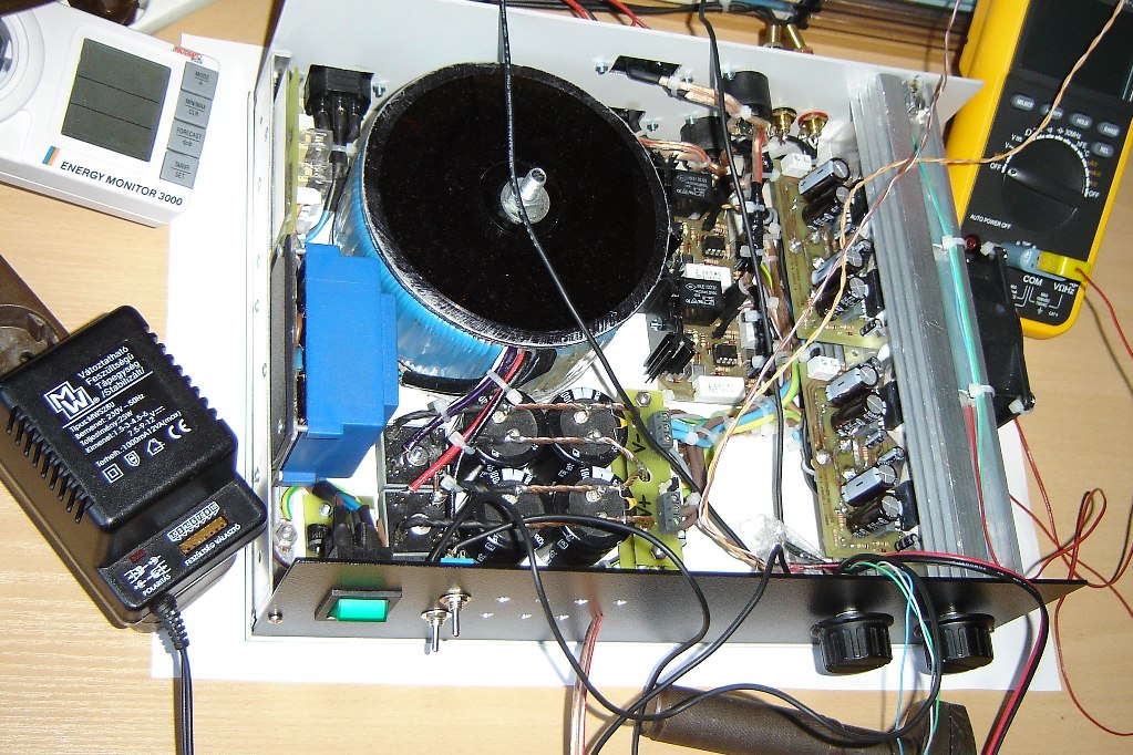 Kicsit átalakítottam a nyolc éves 7294 híd végfokomat,mivel jó áron jutottam toroid trafóhoz vettem két db 320W 2*25V-ost,l adott volt a régi táp azt meghagytam és készítettem a másik trafónak is egyet,majd mind a két trafót árnyékoltam.Igy most a két monoblock két külön tápról megy (2*40000uf szürés lett).Tettem még a dobozba egy mély váltót, és ennek egy stabilizált szürt szimetrikus +/-15v os tápegységet egy 2W-os öntött trafóval.Ez azért kellett,mivel többségben csak az egyik blokkot használom egy dupla mélynyomós mély láda meghajtásához 5,1 rendszerben,a bemenete és a kimenete is ki van vezetve két rca aljzaton a doboz hátulján,igy csak át kell kötni egy vezetékkel vmelyik csatornához,hogy aktiv szub legyen a rendszerből,vagy akár egy "y" kábellel elosztani a jelet és mind két végfokba bekötve két mélyládát is meg tud hajtani a két monoblock.Még adtam neki egy automata hűtés szabályozást is,ami két db 80*80mm-es 2,6W ventit működtet. Élőfoknak sztereó üzemben egy Omnitronic DJ50-et használok.Lemértem mit tud igy a "kicsike"; Tehát táp 640W 2*35V terheletlen és 2*30V max terhelésnél.Hálózati fesz stabilizált 230V.Hangszínszabályzó 0db állásban,direkt meghajtás. 8ohm hangfal,ill műterhelés 471.5W felvétel, 2*155W 0,8% . A 14,5cm hosszú,11cm széles 13 szárnyú borda 42fokon stagnált,a diódahidak (25A 400V) bordái 45 és 50 fokosak voltak.Trafók 45fok. Ezzel a táppal eszméletlen erőtartalékkal rendelkezik,nagy teljesítményen is stabil tiszta hanggal.