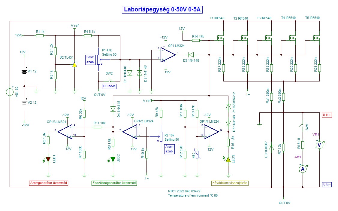 Igen ez még csak terv, amint írtam is. Ez még nem a végleges kapcsolás. Hiányzik a rajzról a transzformátor, a szűrőkondik és a stabkockák is. Idézet: „OP1/3 és R6, R7, R11 nem is kellene igazából, a LED1-et az R5-ös előtét-ellenállásával együtt ugyan úgy oda lehet kötni az OP1 kimenetére mint a LED2+R8-at az OP1/2 kimenetére.” Ez csak azért van, hogy kihasználjak minden OPA-t. A Z1 azért kell, mert ha a hővédelem bekapcsol, az OPA kimenete -12V körüli feszültségre billen. Idézet: „A Z1 csak azért kell, mert ha a hővédelem bekapcsol, az OPA kimenete -12V körüli feszültségre billen.” Igen, na de a szabályozást végző OPA-k (OP1 és OP1/2) ugyan úgy -12V körüli feszültségre billennek. Nem értem, akkor vagy mind a három helyre kellene, vagy az egyikre sem. De mivel a FET-eknek nem lesz semmi baja -12V-tól, így nem kell egyik sem. Idézet: „Igen, na de a szabályozást végző OPA-k (OP1 és OP1/2) ugyan úgy -12V körüli feszültségre billennek.” Nem billennek -12V ig, mivel vissza vannak csatolva. Viszont, ha a FET kibírja, akkor valóban nincs rá szükség. Egy kérdés: a FET-eknek mennyire szükséges a gate ellenállás?