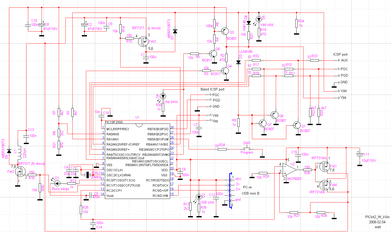 ui. A klón tervezésekor nem volt könnyű a megfelelő alkatrészeket kiválasztani, főleg olyanokat, ami kapható is és nem aranyáron. Én ebben látom a legnagyobb nehézséget. A kész áramkör letesztelése sem túl egyszerű, mert nem árt pár db olyan PIC, ami 16bites, alacsony feszültségű a Vpp és a Vdd, stb. Én a helyedben kipróbált áramkört építenék kész nyáktervvel.