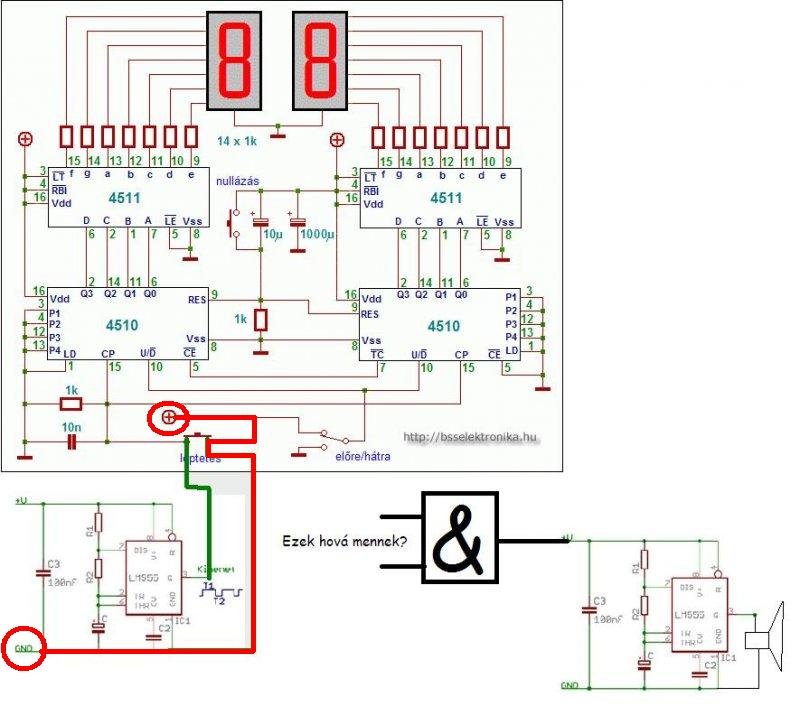 Na és ha úgy csinálnám,hogy beállítom a kijelzőn a 60-as számot,az előre/hátra kapcsolót hátra állásba,és miután mindez kész,rákapcsolom a jelgenerátort,ami 1 Hz-es frekvenciával 0-ig visszafele számol,és mikor eléri a 00-t akkor a NAND-os ÉS-es kapcsolás kimenetén lévő kapcsolás csipog/világít.