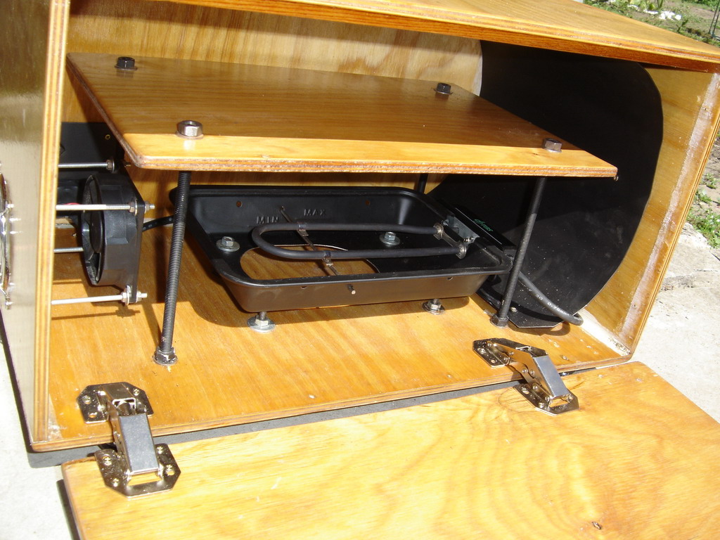 Szerintem jó ha van az embernek egy ilyen mert abban minden félét lehet szárítgatni. Én a légkeverés híve vagyok. A belső levegőt kell keringetni egy kis 8cm-s ventillátorral. Szerintem a lakknak semmi baja sem lesz egy kis portól. Az enyémben egy "mini grillből" származó fűtés (500W) van amiben van egy gagyi hőfokkapcsoló és az tartja melegen a dobozt. Általában túl fűt (60-70 fok), de egyenlőre még ebből nem volt gondom. Én 50 fokon szeretném tratani a belsejét, de majd egyszer a vezérlő is elkészűl... Előtte egy fekete cipős dobozt raktam a sütőbe, de az nem nagyon volt jó. ![]() A nyákot a felső fa lapra rakom (alatta hőterelő lemez van) és alúlról azon a fekete lemezu íven keresztűl fúlyom fel a meleg levegőt. A víz leszárítása az nem az igazi ahhoz a nyákot megpróbálom felálítani, de a lakkokat nagyon jól lehet szárítani.