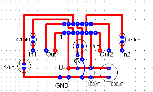 Tükrözni kellett volna a nyákot! Most viszont úgy fest a helyzet, hogy az IC 7-es és 8-as lába van összekötve, és ez van a negatív tápra kötve, a 9-es lába pedig a tápra, ami ugyebár a negatívra kellene. Illetve így a 6-os és a 10-es lábak is felcserélődtek. A többi láb elvileg tükörszimetrikus, így azokkal nem lenne gond, de az említett lábak felcserélése nem egészséges. És ne vedd sértésnek, de az a nyák nem a legszebb. Valamint ha jól látom, az IC-t vezetékekkel kötötted be? Bár ebből kifolyólag legalább könnyen felcserélhetőek az említett felcserélt lábak. A kérdés, túlélte-e az IC?