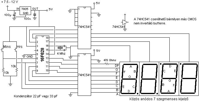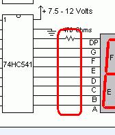 A HC541 azért még is egy CMOS buffer és nem áramkorlátos Led meghajtó. Számomra az is érdekes, hogy a rajzon, 7,5..12V táp szerepel, míg az adatlapon ajánlott tápfeszültség tartománya 2..6V. Egy-egy kimenet maximális árama 35mA lehet, de a tok összes disszipációja (SOIC) 500mW. Én ezeket a határértékeket nem lépném túl.