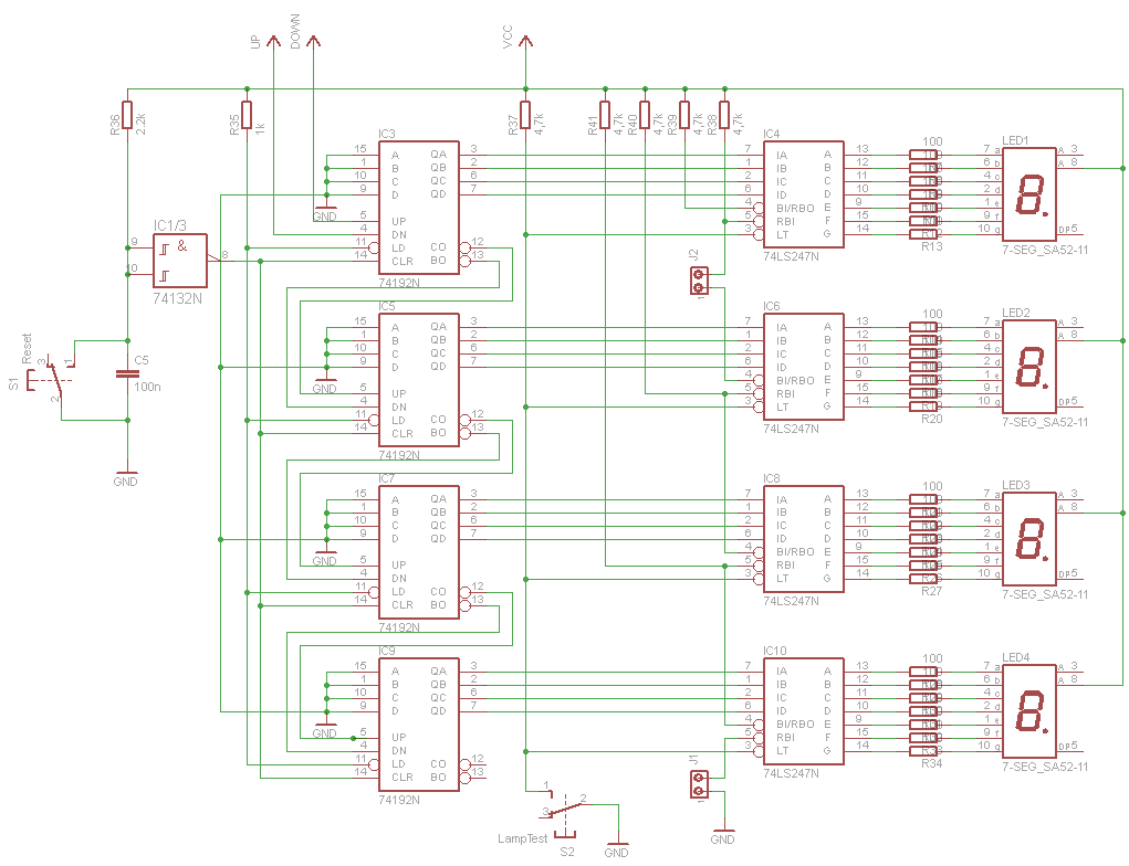 Az S2 kapcsoló a meghajtó IC lámpateszt bemenetét húzza le testre ekkor a számbemenetek értékétől függetlenül kigyulladnak az összes szegmensek, érdemes belerakni a kapcsolásba mert akár menet közben is lehet tesztelni a kijelzőket vele. Az S1 kapcsoló a számláló IC-ket reszeteli azaz ezzel lehet nullázni a számlálót menet közben, a C5 kondenzátor a bekapcsoláskori reszetet végzi. A Led1 a legkisebb helyi értéken áll a Led4 a legnagyobbon.