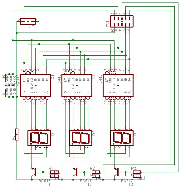 A kapcsolásban szereplő meghajtó IC open kollektros így csak közös anódos kijelzőt tud kezelni. Ha jól tudom a két IC között csak annyi a különbség hogy a 47-es nem teljes 6-os és 9-est jelez ki azaz 9-es estén nincs meg a legalsó vízszintes szegmens (d), a 6-osnál meg a legfelső vízszintes szegmens(a), ezeket külön kapuzással lehet hozzárendelni. Ezért használtam én 247-est. A feltöltött kapcsolási rajz csak egy részlet amint az egész megépült ( egy tekercselőgép számlálója lesz optokapukkal ) felrakom majd a ki mit épített topikba. Mivel a PIC-hez még egyelőre nem értek ezért maradtam a logikai kapuknál.
