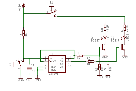 A 74HC93-nak állandó táp kell (az IC egyben "memória" is, tartja az állapotot), a kapcsolóval a tranzisztorok tápját kapcsolhatod.