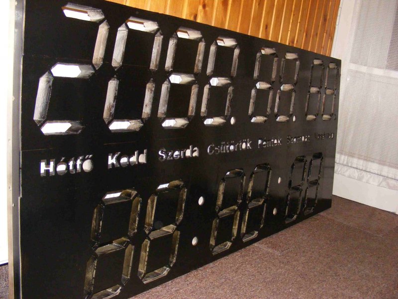 Úgy gondolom eléggé nagyot alkottam ahoz hogy bemutasam az eddigi legnagyobb munkámat. Ez egy igazán óriás óra, kb fél évig dolgoztam rajta mire készen lettem vele. DCF vevő veszi a pontos órajelet. 570 darab 10mm-es piros LED van benne. PIC 16F877 vezérli a LED-eket optócsatolókon keresztül. A program megirásával sajnos nem dicsekedhetek mert ahoz sajnos nem értek. Bevezetönek talán ennyit, jöjjenek a képek.