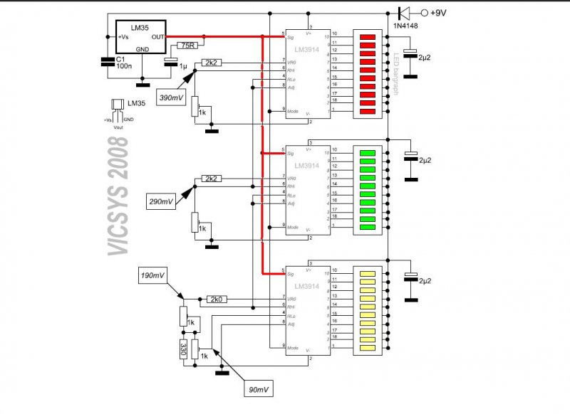 Márpedig nekem a pirossal jelzett vezetéken feszültség van akkor is, ha kiveszem az ic-t meg az LM35-öt is. Tehát tuti ,hogy a NYÁK-kal van a baj.Még elleszek vele pár órát, mire rá jövök a hiba okára.