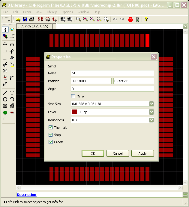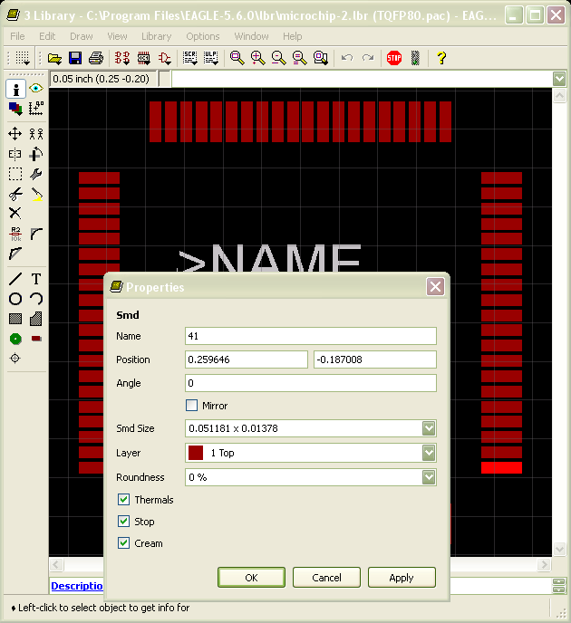 Vagy nyisd meg a lbr-t és ott a 18F8722-őt kiválasztva (Device) meg tudod nézni a tokhoz rendelt kivezetéseket. A tokot is tudod ellenőrizni. Megnyitod szintén a Library-ban a Package ikonnal, majd csak a top layer-t bekapcsolva az Info ikonnal végig mész a pad-eken. Így láthatod a számozásukat a Name ablakban.
