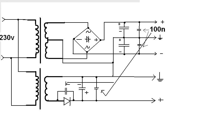 A 300VA nál +-tápot csinál összekötött 2 vezeték ami a trafóról jön az pedig a gnd a másiknál szimpla táp Mindkét trafó vezeték be diódahídba.