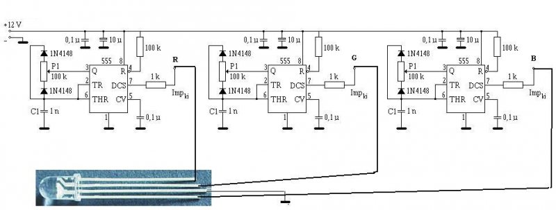 Nem érthető a kérés, mert nem tudni miről beszélsz. Idézet: „szín 1 LED ben van 3 pozitív és közös negatív csatlakozással” A Led-ek, diódák. tehát nem "3 pozitív.." hanem három anód, és közös katód kivezetés van, ha jól értem. (Egyszerűen szólva, közös katódos a dióda.) Idézet: „nekem olyan PWM kellene amiből hármat megépítve közösíteni tudnám a negatív kimenetet” - Ez a kapcsolás, nem PWM, hanem analóg, hiszen az áramkör alapvetően különböző frekvenciájú lassú háromszögjeleket gyárt. Ezzel a PWM kapcsolással, amit feltettél, nem lehet közösíteni az analóg részt. Viszont azzal a PWM-el, amit én feltettem, lehet(ne). - Viszont a diódák katódja van a negatív tápon, tehát ha a Te diódáid is közös katóddal rendelkeznek, akkor az analóg áramkör (háromszor) jó hozzá. - Viszont ha a diódákat sorba szeretted volna kötni, az eleve nem megy. Ha háromszor építed meg, akkor a három dióda, különböző színekben fog egy időben világítani. (De lehet ez az eredeti szándékod is) Viszont, ha egy-egy áramkörre akarod kötni a diódákat, akkor csak külön előtét ellenállás kell eléjük. Szóval, mi is a helyzet? - Milyenek a diódák? - Hány darab van belőle? - Mekkora a tápfesz? - Mekkora a diódák működtető árama és nyitófeszültsége? (Az analóg rész tápfeszére, viszont nem ártana egy kondi.) Amúgy mi baj volt ezzel a kapcsolással? üdv! proli007