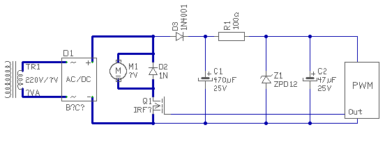 A szabályzónak, nem szükséges külön trafó, annak fogyasztása 10..20mA között lesz. Mert mint írtam a teljesítmény egyenirányítóról, egy diódával levehető a szabályzó feszültsége. Így a dióda utáni kondit nem tudja kisütni a motoráramkör, mert a dióda lezár. Valami ilyesmire gondoltam. üdv! proli007
