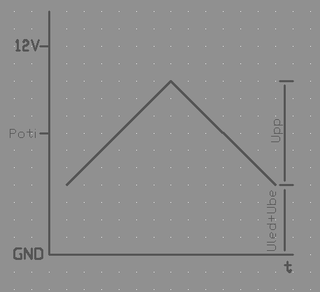 - Az hogy más problémát talál benne, attól az áramkör még jó lehet. Minden esetre, a Led-hez való illesztést, figyelembe kell venni. - Amit lerajzoltál, PWM kapcsolást (kép.jpg) az nem működőképes. (mintha nemrég leírtam volna, hogy működik az 555 kimenetei) Ugyan is a 7. láb nyotott kollektoros kimenet NPN tranyóval, tehát az feszültséget nem ad ki, csak le tudja húzni az áramot. Ezen a lábon, csak úgy tudod vezérelni a Led-et, hogy az 1kohm ellenállást a 7-es láb és a plusztáp közé kötöd, a Led-et, meg a 7-es láb és a mínusz táp közé. (Katódok a mínuszon) - Amúgy nem akarlak elkeseríteni, de Led-eknél a PWM meghajtásnak nincs előnye. Mindössze annyi van, hogy nem a tranyó fogja eldisszipálni a felesleges hőt, hanem a soros ellenállás. Ráadásul, a Led impulzus üzemben, látszólag kevesebb fényerőt veszít, mint analóg üzemmódban. (A multiplexeres vezérlésnél, pont ezt használják ki) Magyarul, analóg jellel vezérelve, jobban halványul a Led, mint a PWM-el. És a fogyasztás sem lesz kevesebb. Akkor meg minek a küzdelem. A PWM meghajtást, szinte ugyan úgy kell illeszteni az analóg részhez mint a Led-et. Szóval kis teljesítmény esetén mint itt nem sok értelme van az erőlködésnek. - Az analóg áramkör, előállít egy lassú háromszög jelet. Ha a poti középen van, akkor a jel közepe kb. a féltápon van. De a lényeg, hogy a fűrészjel csúcsának alja, az Uled+bázis-emitter feszültségen legyen. Ezt a potival kell beállítani. (azaz, hogy a Led éppen csak kialudjon) Aztán a háromszög csúcsa, pedig minél közelebb a plusztáphoz. Az előtét ellenállás számításához, pedig a háromszögjel csúcstól csúcsig mért feszültségét el kell osztani a Led maximális áramával. Ennyi a feladat. pld. ha a Led feszültsége 2V akkor a háromszög alsú csúcsának 2,65V-on kell lenni. A háromszög csúcsfeszültségét a tápból és a 100kohm/22kohm-ból lehet kiszámolni. Az IC 7. kimenete legfeljebb 1V-ra tudja megközelíteni a tápot. Így a 100kohm-ra 12V-2V=10V jut maximálisan. Ez az ellenálláson 10V/100kohm=100uA áramot jelent. Ha a 22kohm felől ekkora áram folyik a háromszög jel felől, akkor ott fog komparálni az IC. 100uA*22kohm= 2,2V Tehát 2,2V lesz a háromszögjel Upp feszültsége. 20mA Led-áram esetén, ez 2,2V/20mA=110ohm Led előtét ellenállást jelent. (Nem tudom az eredeti kapcsolás hány mA Led-áramot feltételez, de a 33ohm kevésnek tűnik, mert ez 66mA áramot jelentene.) Viszont, a 2,2V háromszögjel feszültség, nem túl biztató, 12V mellett. Célszerű lenne a csúcsértéket növelni. Ezt a 22kohm növelésével lehet elérni (a freki is ennek megfelelően lassulni fog) 47kohm esetén, a csúcsfeszültség, már 4,7V lenne, így 220ohm is jó a Led elé (21mA). De ez függhet a Led nyitófeszültségétől is. Viszont nagyobb háromszögjel esetén, könnyebb a Led illesztése az áramkörhöz. Szóval, mérd meg a Led-ek nyitófeszültségét, a névleges áramuknál, és akkor számítható ki igazán a dolog. üdv! proli007