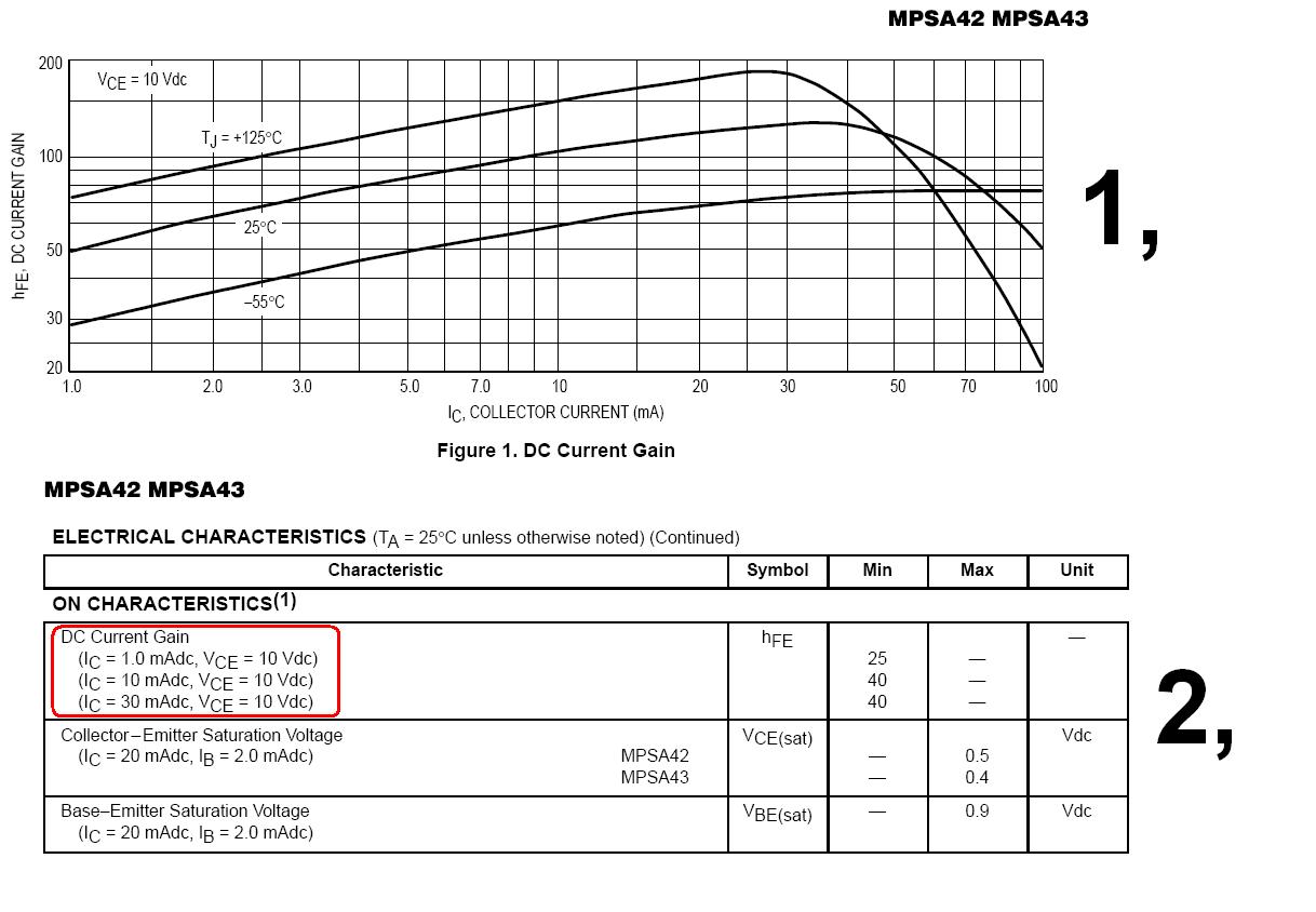 Lenne egy nagy problémám amin remélhetőleg (biztos) tudtok segíteni.. Ez pedig a tranzisztor bázis ellenállás számítás Topi cikkében ott van minden Itt a lap közepén De nekem valami nem világos.. Egy AVR hez szeretnék egy pár MPSA42-es tranzisztort "illeszteni".. Az avr 5V-ot ad maximum 20mA árammal.. Nekem Nixe csövet kéne vezérelnem a tranzisztorral... Ami 180V kb 2mA lenne a C-E áram.. Nézem az Adatlapot (a motorolás adatlap jobb mint az előtte lévők) Néztem a grafikont.. De valamit nagyon nem értek, ileltve nem csak egy dolgot hanem többet.. A csatolmányban ha nézem az 1-es grafikont akkor ha nézem a 2mA nál akkor nekem a béta már 30fölött van.. Valaki el tudná magyarázni hogyan kell ezt nézni? Aztán a 2-es számozásnál a keretezett rész mit jelent? Most csinálnák először ilyet de nem tudom hogyan kell.. Aki tud, kérem segítsen.. Előre is köszönöm! Üdv! UI.: Az egyes táblázaton miért van három görbe? Azok a hőmérsékletek egy-egy görbéhez tartoznak? Nekem a 25C fokosat kell használnom? Idézet: „Azok a hőmérsékletek egy-egy görbéhez tartoznak?” Igen, ott is van a görbén, hogy hány fokhoz. A méretezést kapcsolára használt tranyóknál nem szoktuk kihegyezni a bétára. Megnézed mekkora a legrosszabb béta, és választasz egy olyan ellenállást, ami jelentősen túlvezérli áramban a tranyó bázisát a minimális áramhoz képest, amit a béta kívánna, a kapcsolni kívánt áramot figyelembe véve, miközben vizsgálod, hogy az (AVR)vezérlő láb elbírja-e ezt az áramot. Itt pl. 1..2kohm jöhet számításba. Ez bőven elég a tranyó teljes kinyitásához, és simán meghajtja a kimenet is. A bázis jelentős túlvezérlését úgy értsd, hogy a bázison folyó áramnak van maximuma, ami az adatlapból kiolvasható, de egy ésszerű bázisellenállással ezt az értéket meg se közelítjük, miközben a bétából következő áramhoz képest a "túlvezérlés" megvalósul a gyors és biztos kapcsoláshoz.