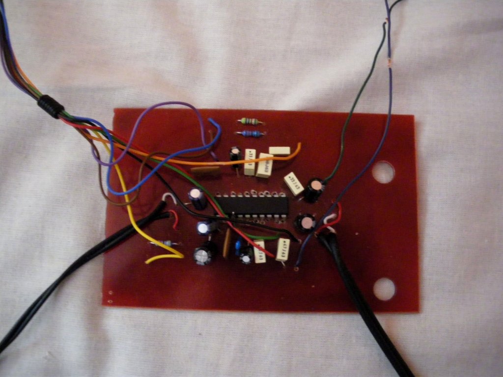 A panelen annyi ellenállás van mint a tervben is szerepel. Az egyik maradt csak le, de azt a másik panelre bepótoltam. Az összes poti Lineáris. Az IC csak azért nincs tokban mert a helyi "elektro" üzletben nincs (tulajdonképpen nincs nekik semmi, pl: potiból is csak 1 fajtát tartanak) és rendeléssel meg nem tudom megoldani, mert van egy minimum összeg amit leküldenek, meg kb 1 hét és 1 hónap közötti a várakozási idő. Az IC-re vigyáztam, hogy ne hevüljön túl. Addig volt csak hevítve, ameddig bírta a kezem. zárlat nincs multival át van mérve. Furcsa képpen csak a hangerő nem működik megfelelően a többi szépen működik, még a loudness is. Ha ez számít elemről próbálkoztam, mert a dugasztáptól nagyon zúg.