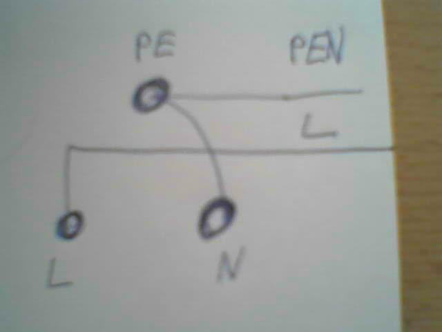 Ez igen érdekes eset! Annyit jelent ez a TN-C nálatok, hogy a nullát átkötötték a védővezetékre és 2 kábelt húztak mindenhová vagy kihúzták a 3 vezetéket? Ha 2 kábel van, újra kell vezetékezni vagy lekötni a védővezetőt és nem földelt aljzatot felszerelni. Biztosan nem szabványos, de azon merengek, hogy ha a nulla keresztmetszete megfelelő, akkor attól függetlenül, hogy leágaztatták a védővezetőt, felhasználható-e PEN-ként a nulla? ( szerintem nem, de lehet, hogy nem okozna problémát! ) Idézet: „Ez igen érdekes eset! Annyit jelent ez a TN-C nálatok, hogy a nullát átkötötték a védővezetékre és 2 kábelt húztak mindenhová vagy kihúzták a 3 vezetéket? ” Nem volt külön nulla és védővezető, csak PEN vezeték volt, én is terveztem házi villanyszerelés órán belső elosztóhálózatot, akkor még a szabványtalan PEN vezetékkel. Idézet: „Ne haragudj, nem esett le, hogy nem Magyarországról van szó!” Hát mondhattam volna korábban is, hogy nem MO, de azt hittem a helyzet ugyan az. Akkor ezek szerint MO -n ősidők óta kihúzzák a három vezetéket a konnektorokhoz. Idézet: „Ha 2 kábel van, újra kell vezetékezni vagy lekötni a védővezetőt és nem földelt aljzatot felszerelni.” Itt nincs földeletlen aljzat, csak földelt. Régen a lenti rajz szerint kötötték a konnektort, ami úgy tudom 2000 óta nem szabványos. Egyébként próbáltam már Szlovák fórumokon is rákérdezni a problémára, de hát még nem találtam megfelelő fórumot.