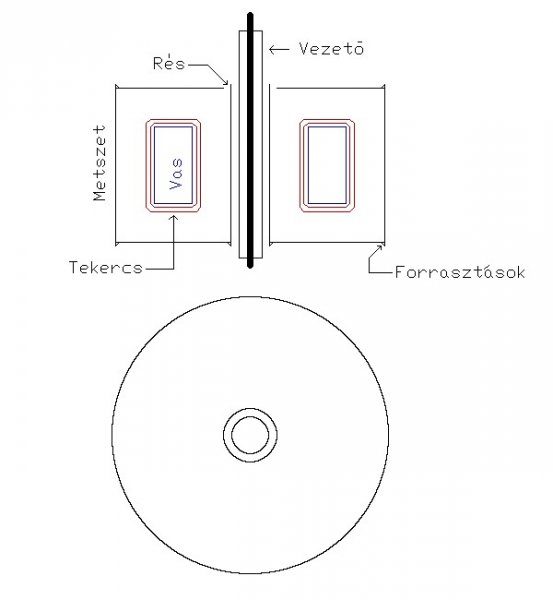 Nekem nincs, de hátha kis info is segít.. A gyújtásvizsgáló strobifejeknek (amit én láttam) két típusa van. Az egyik egy csipesz, ami kapacitíven veszi le a gyújtókábelről az impulzust. Egyszerű strobinál nem gond ha van áthallás, és másik hengernél is villan, viszont szerintem mérésre nem alkalmas. A másik, tulajdonképpen, olyan mint egy lakatfogó. Itt egy ferrit U alakot, (amire a tekercs is rá van tekerve) egy mozgatható I alak zárja, ha rátolod a vezetékre. Ez szerintem valamivel szerencsésebb megoldású, viszont érdemes a tekercs alatt és felett, egy földelt réz fóliát tenni. (nem rövid zártat, tehát szigetelő csíkkal kell együtt feltekerni, és a vége ne érjen össze.) A tekercs két végét célszerű az árnyékolt vezetéken belül vezetni, és az egyik végét, a szkópnál a GND-re kötni. A lemez árnyékolást a kábelárnyékra kötni, és azt a szkóp házára. Talán így szedi össze a legkisebb zavart. Amit még láttam, egy Tesla gyújtásvizsgáló szkóphoz volt. Ez gyakorlatilag ugyan az, mint az előbbi "lakatfogó" csak ez inkább egy áramváltó. A primer "tekercse", maga a rajta átdugott gyújtásvezeték. A szekunder, meg egy gyűrűmagra volt feltekerve. Az egész egy sárgaréz ("konzervdobozban") házban volt elhelyezve, melynek egyik fedlapja (ahol a légrés is volt, hogy ne legyen egy rövidzár menet a doboz) kicsavarozható volt. Így itt lehetett betenni a gyűrűmagos tekercset. (Nem szedtem szét, így nem tudom hány menet volt rajta.) A tekercs bekötése, és a vezeték kialakítása, mint fenn. Leskicceltem, talán érthető és szerintem kísérletileg viszonylag egyszerűen legyártható, egy bádoglemezből. BNC osztót én még csak 50/50ohm-osat láttam gyárit, 1:2 1:10 osztással. De egy BNC aljzatból és dugóból és kis nyáklemez közbeiktatásával, magad is készíthetsz. Ha lassú jeleket vizsgálsz, akkor nem kell kompenzált osztó, elég két ellenállás. üdv! proli007