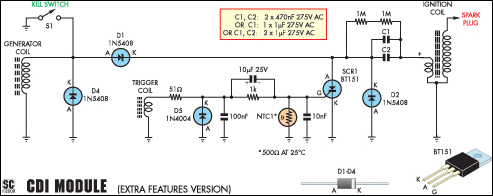 Megmértem, a kondikat (2x470nF 400V) kb 140V-ra tölti egy fordulatra, de a szikra nem valami veszélyes. A Gate körben sorban van egy 20ohm, egy4007-es dióda, majd 10u50V, és 1K párhuzamosan. gate.katód közzött 1K kondikkap párhuzamossan 2Mohm.