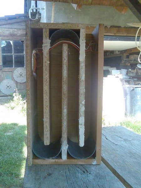 Mi mindenből lehet igencsak jó hangot kicsikarni....ezt a kicsi TL-t a ruhásszekrény maradákából csináltam. Reflexnek is jól szól, akkor nem kell a két szélső terelőlemez, csak a középső (de anélkül sem rossz, csak akkor többet kell a csillapítással foglalkozni). A belső méretei 17*24*48, ekkor a reflexnyílás hátul, felül van teljes szélességben. Az érzékenysége reflexben jobb, mint TL-ben, viszont TL-ben egyenletesebb az átvitel és valamivel mélyebbre megy. TL-ben nem kell bele csillapítóanyag sehova. A cső membránfelülettel megy végig (nagyobb átmérő jobb lett volna, de ennyi volt a maradék), kb.1,7 m hasznos hosszú (50 Hz körül).