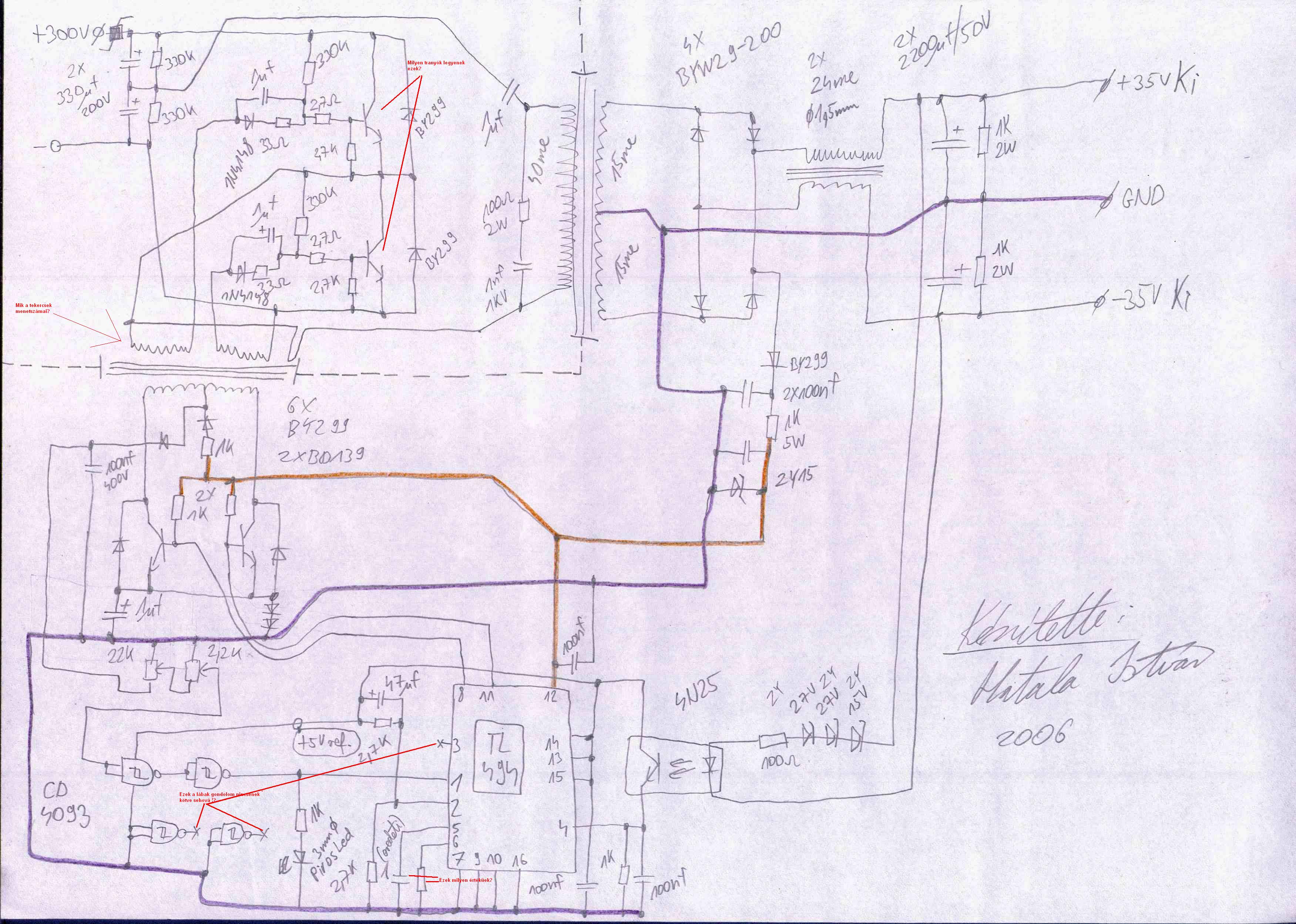 De igazából még se mert amikor rányomtam a feszt a két kapcsolófet megsült(IRF730). Pontosambban az összes lába ezentúl már rövidzár. Nem tudom mér lehetett én a vezérlőtrafóra gyanakszom ami az ic és a gatek közt van. Még az éles próba elött kipróbáltam csak a vezérlés részét meg szkópon megnéztem a gatekte menő jövendőbeli jelet de nem volt valami szép, gondoltam rá hogy lehet nem lesz jo. Pedig figyeltem a vezérlő trafó tekercseinek jó bekötéseire de hiába.