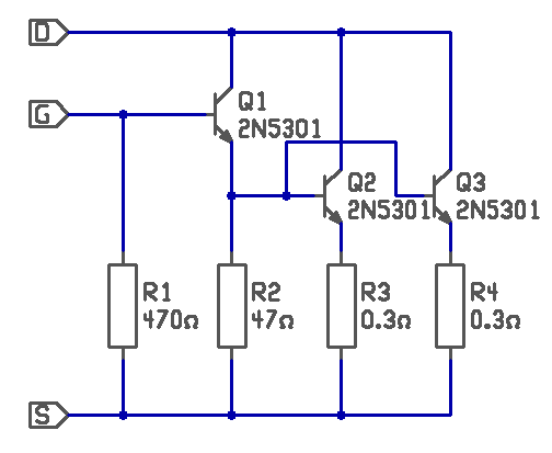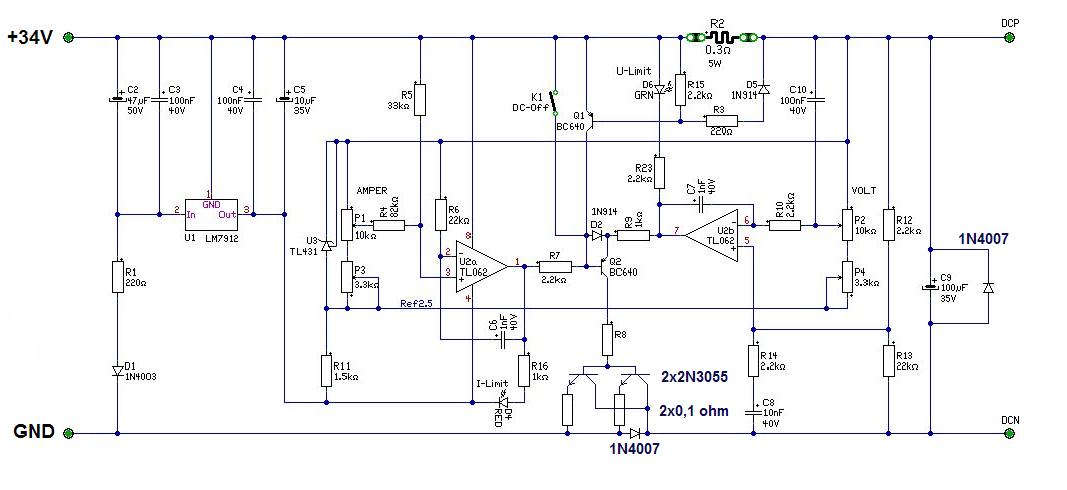 - Doncso-nak teljesen igaza van. Itt mind két tápágban van valami. Ahhoz, hogy szimmetrikus táp legyen, az egyik ágban nem lehet semmi. - Önmagában a tranyó, nem elegendő, mert a meghajtó áram nem lesz elegendő. Ezért darlington kapcsolás szükséges a Fet helyett. Viszont így a maradék feszültség (Dropout) lényegesen magasabb lesz, mint a Fet-el. - Én ugyan a teszt áramkörnél nem 2N3055-öt használtam, de azzal is menne. Íme! üdv! proli007