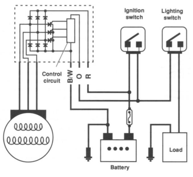 Hali! Ez egy egyszerű 3 fázisú fesszabályzó. Utánépítéshez megtalálod a rajzait a topicban, még a nyákrajzot is belinkeltem. Yamaha XT600-asomban ilyen ketyeg már vagy 2 éve kifogástalanúl. Az O jelű vezetéked a feszültség érzékelő szál, az R a fesszab pozitív kimenete, a B/W pedig a föld (a tápfesz negatív sarka).