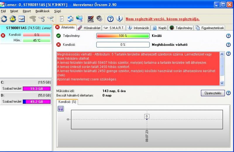 Szerintem ne is használd mindaddig amerevlemezt, amíg le nem menttél mindent rólla! A gyenege szektorok alapján szerintem kevesebb mint 143 napod van hátra.