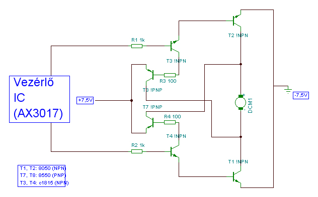 Minap szedetem ki egy távirányítós autóból a vezérlő (vevő) áramkört, mert szeretném felhasználni egyéb célra. A feladata a jövőben annyi lenne, hogy 2 motort tudjon hajtani mindkét irányba, csak ott a bibi, hogy elég nagyok a leendő motorok az autóban lévőkhöz képest. A kérdésem az lenne, milyen tranzisztorokkal helyettesítsem a motor meghajtó tarnyókat (típus: 8050[NPN], 8550[PNP]) Hogy bírják hajtani a motort túlmelegedés ( leégés) nélkül. Motor adatai: 16W 29V én ezt csak 14 voltról szeretném működtetni, ennél a feszültségnél kb 400mA az áramfelvételük terheletlenül, terhelve akár 1,6 A is lehet. (összedobtam egy rajzot a panel alapján visszafejtve egy motor vezérléséhez) üdv
