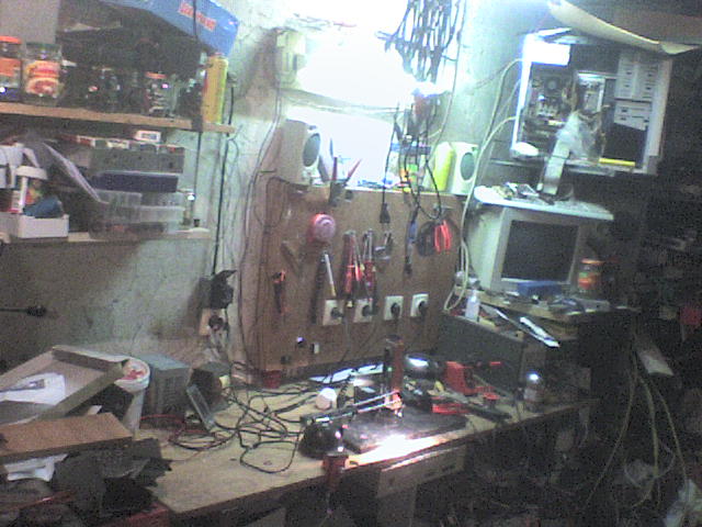 Megmutatom a készülő de sosem kész műhelyem, fáskamra egyik része, kicsit szűk de jó lesz ha majd egyszer készebb lesz. Minimál természetes fény, rend az még nincs, szelektálás folyamatosan megy. Bár nem látszik de trafóból elég sok van, azoknak van egy műanyag bevásárlódoboz, olcsón osztogatják, talán kibírja, összedobálásnál jobb. Nem kenyerem a dobozolás, leválasztótrafó is az asztal közepén, cenzúra a készítő barátom miatt, erről maximum privátba mondok valamit, csak hogy figyelmesebben nyúkáljak bárhová. Gépnek vége, van benne wlan net miatt de most meghalt a win és lusta vagyok a dvd írót kibányászni a szobai gépből, kell még bébisüveg, kevés van nagyon. Talán még egy újfajta dobozkát is bevetek szeparátornak, de ezen gondolkoznom kell hogy hogyan. Remélem lesz időm tovább építeni a műhelyecskét.