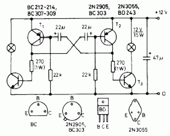 Szeretnék csinálni egy két LED-es villogóbol irányjelző vezérlőt. Már minden majdnem jó, már kész is van, csak amint rákötöttem a 12 V-ot a tranzisztorok megadták magukat.