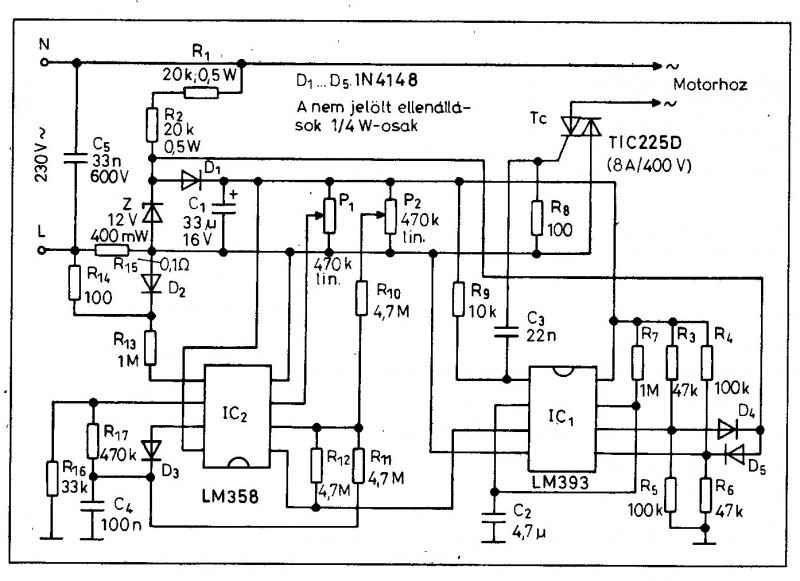 Az a kapcs rajz jó! Csak triak függvénye, hogy milyen teljesítményre tudod használni. Nekem 12A-es triak van benne, és a 2000W-os nagyflex-et nagyon jól szabályozza. A maximum fordulatszámot a diak feszültségének csökkentésével, a minimumot a soros poti értékével tudod módosítani. Azt tudnod kell, hogy csak kefés motorokon tökéletes, aszinkron, és szinkron motorokon nem biztos. Az enyémet rákötöttem a köszörűre, /aszinkron/ és nagyon lecsökkentette a nyomatékát, de szabályozta. Szinkron motorokat, mivel azok a meghajtó feszültség frekvenciájára "szinkronizálnak" rá, és ezért lesznek fix fordulatszámúak, így csak frekvenciaváltóval lehet szabályozni. A mosógépben nem tudom milyen a motor, de nem lehetetlen, hogy jó lesz, ugyanis az autómata mosógép, fázishasítással, de ugyancsak ford.szabályoz. A kapcs. rajzon trafó van, ahhoz is jó, pont arra a két kapocsra kell kötni a motort is.