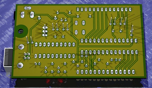 Ez kétoldalas panel, a kondik a túloldalon vannak, de igaz, hogy a tüskecsatikhoz közelebb esnek, mint a lábakhoz, mert akkor még nem volt olyan apró 100n-m. Ha van olyan apró kondid, akkor én is a lábak közelére voksolok! Egyébként nem tapasztaltam problémát egyszer sem, de ettől az elv még nem változik.
