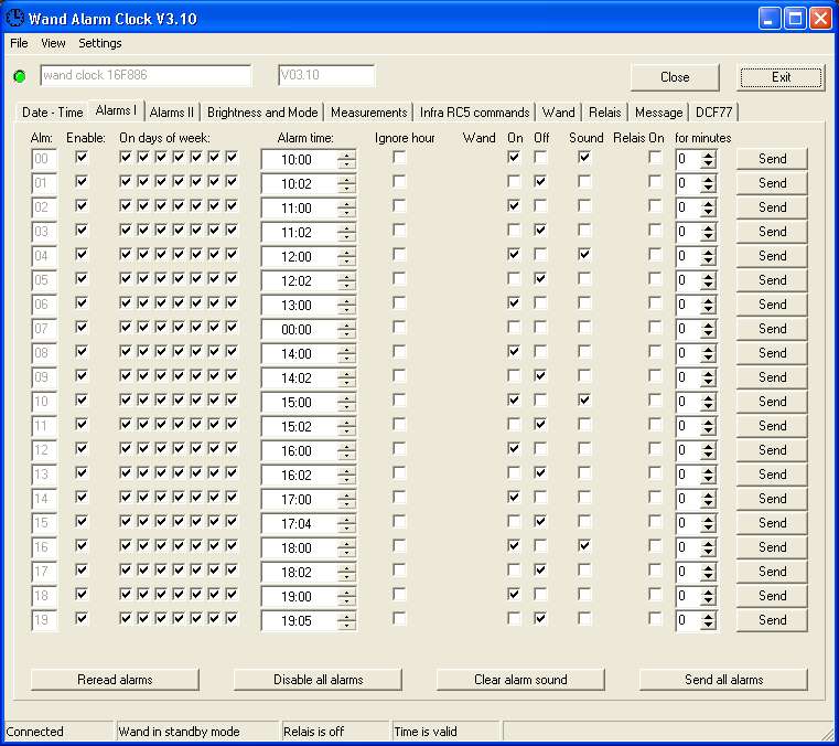 Az Alarm 1-2 beállításait egy egésznapos programbeállítással le teszteltem a 886/3.10-es verziót. Ott semmilyen hibát nem találtam, pontosan kapcsolgatta be/ki az órát. A beállításokról és a Wand lapjáról néhány felvétel, sziasztok.